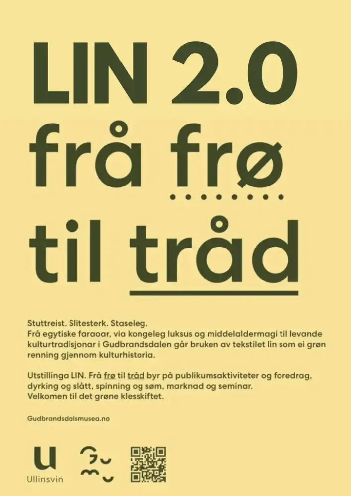Sofasamtale. Suksessutstillinga LIN 2.0 er i 2025 utvida og oppdatert med nye kunsthandverk, fleire aktørarar og rikare historieforteljing og formidling. Utstillinga vev saman dei mange trådane spunne ut av vår eldste kulturplante til ei fiberrik danningsreise gjennom historie, handverk og kunsthandverk. Følg linet si ferd frå frø til tråd, og frå oldtid til grøn framtid.